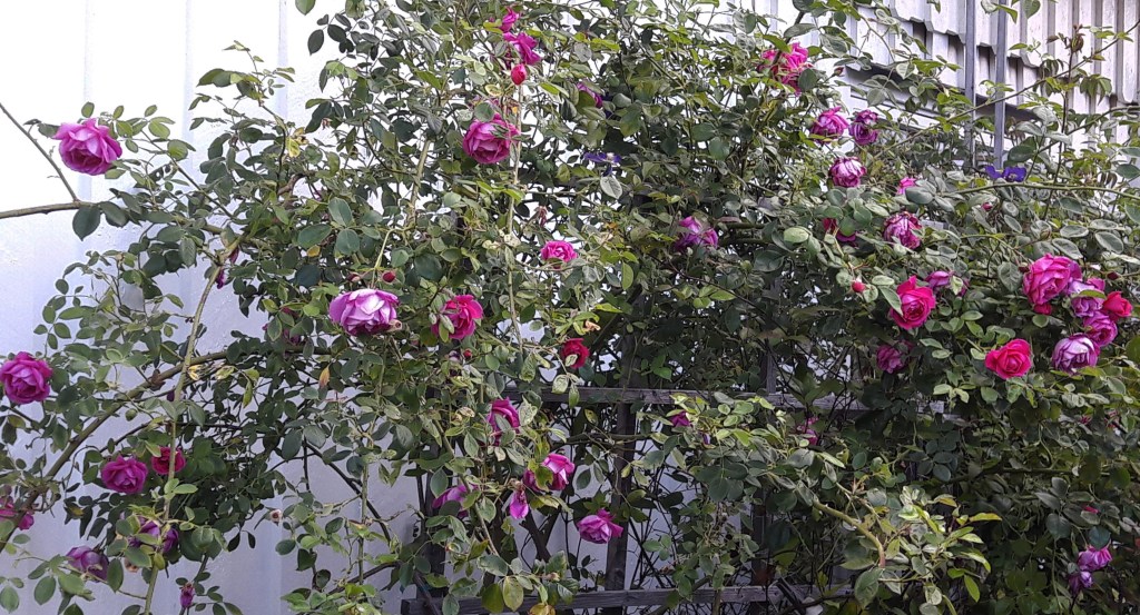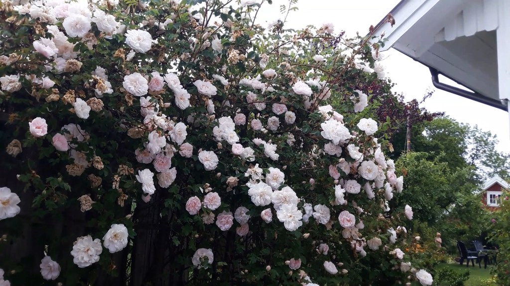 klatrer oppover veggen hos våre gode ferienaboer. Jeg hadde vært på rosehandletur til Roseexperten i Råde i Østfold for ganske mange år siden. Hensikten var å kjøpe ett eller flere eksemplarer fra hver av de historiske rosegruppene + litt til. Rambling Rector var med i gruppa «litt til». Den havna hos naboen. Kan ikke huske om den var et impulskjøp. Trur helst jeg fikk betenkeligheter fordi den bare er sommerblomstrende, og jeg var på jakt etter remonterende klatreroser med duft. «Et væld af små halvfyldte blomster i store klaser. Intensiv duft. Voldsom vækst, god til at beranke træer. Kun til store haver,» skriver danske Rosenposten. Jeg spør meg igjen om kravet til remontering skal være så viktig. En går glipp av mye snadder hvis en er så kategorisk her. Sjøl har vi stor glede av Helena Hybrida og Lykkefund i hagen vår. Begge er sommerblomstrende.
